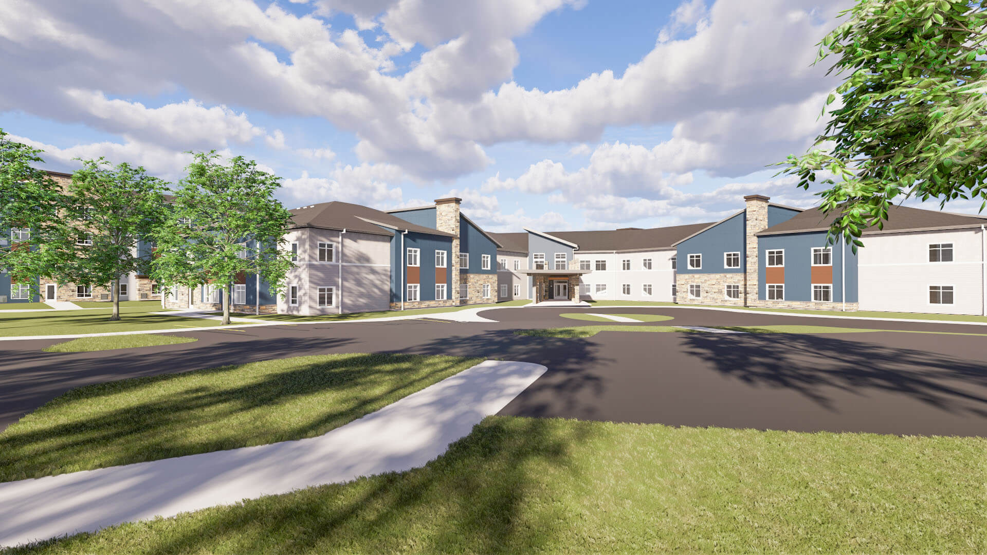 Advanced continuum of care facilities will provide for new resident-centered programs. The campus will continue to provide a full range of living choices at all levels of care for all stages of life – from independent living and Catered Living to memory care assisted living and skilled nursing & rehabilitation (rendering above).